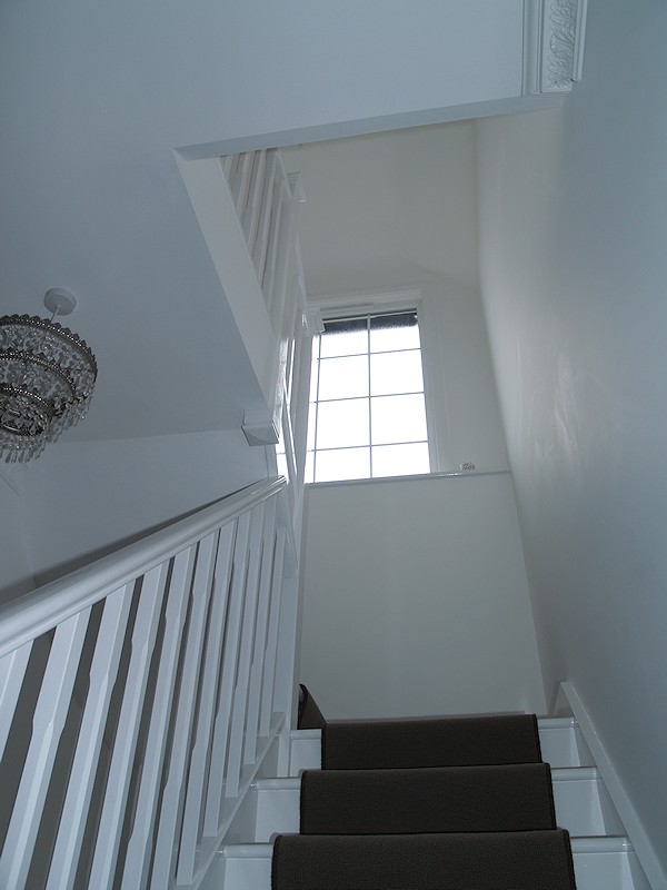 This loft conversion required a staircase identical to the existing one and to be positioned above. The softwood flight is glossed white with a carpet runner up the centre of the treads. The handrail is of our 'crown' design along with stop chamfer 32mm spindles and newel caps specially profiled to match the existing one.