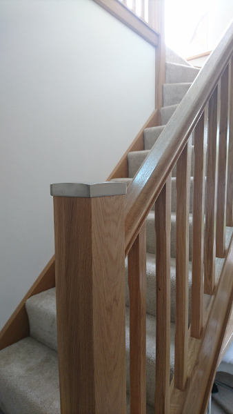 To access a new extension we manufactured this oak winder staircase using our crown profile handrail, stop chamfer spindles and brushed metal newel caps. Once fitted the contractors on site then built integrated desks and storage around the supporting newel post to use as a workspace.